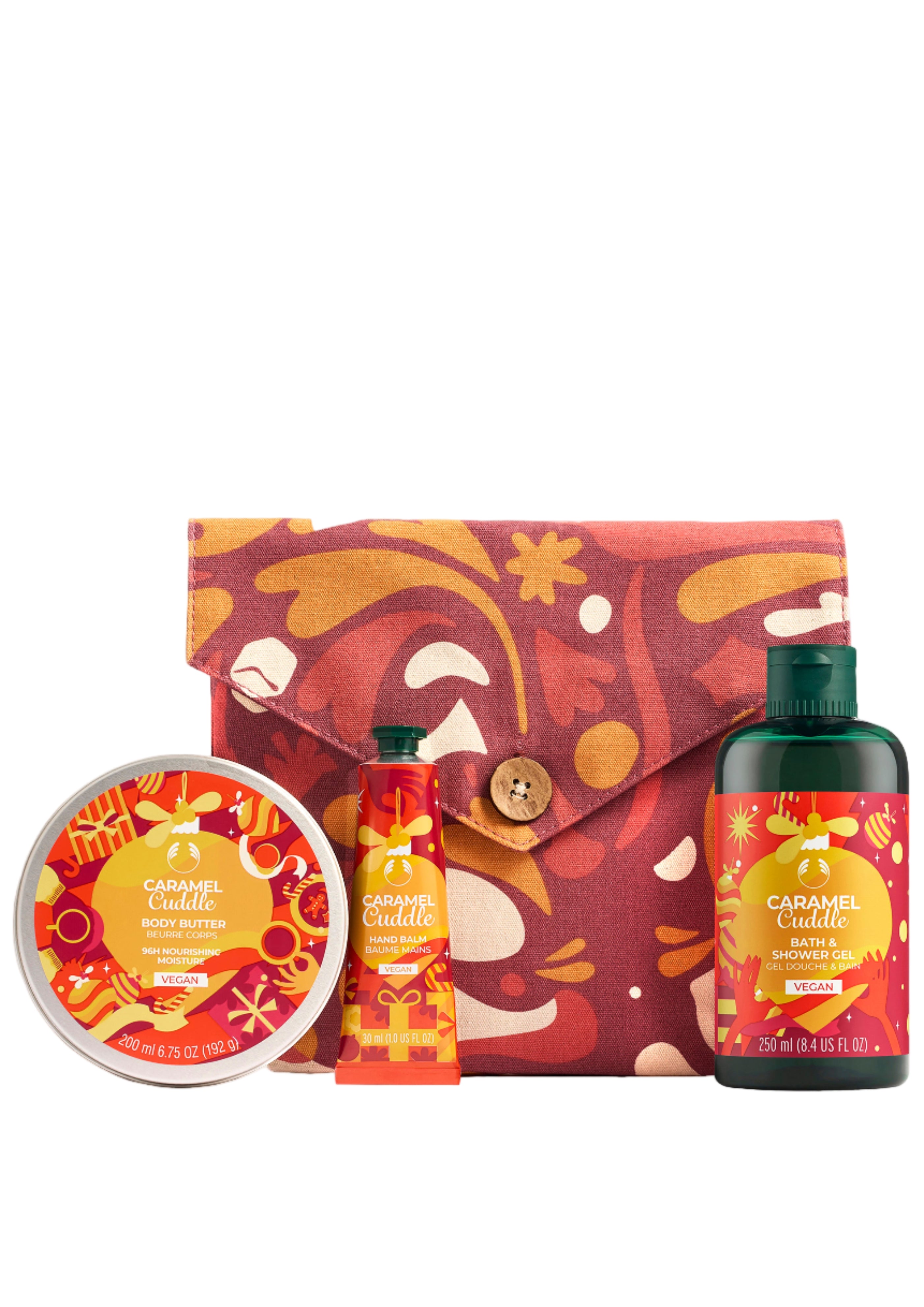 Sæt gjöf í fallegum gjafapoka.  Sturtusápa, Body Butter og handáburður úr Caramel Cuddle baðlínunni.  Yndislegur sætur ilmur af saltaðri karamellu, vanillu og tonkabaun, blandað fersku bergamot og fresíum.