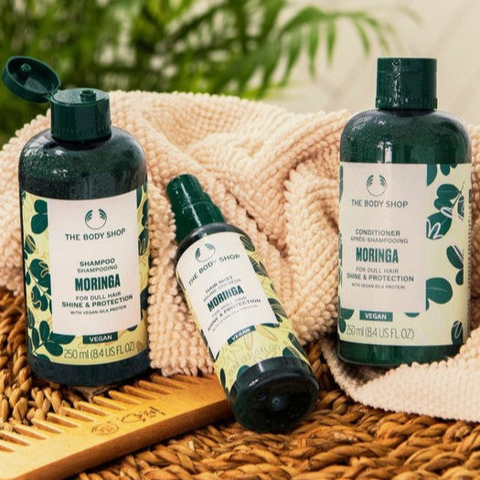 Moringasjampó sem gefur hárinu góðan gljáa og vernd fyrir umhverfisáhrifum. Inniheldur Community Fair Trade moringaseyði frá Rwanda. Hentar vel fyrir þurrt og líflaust hár til daglegrar notkunnar. Umbúðirnar (fyrir utan tappann) eru úr 100% endurunnu plasti, sem er svo endurvinnanlegt aftur.